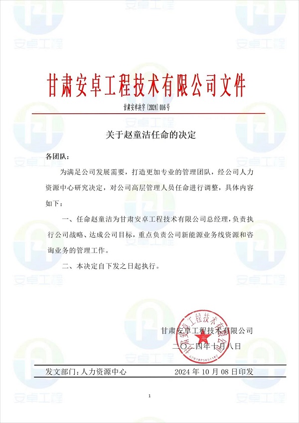 近日,甘肃安卓工程技术有限公司发布重大人事任命,任命赵童洁为甘肃安卓工程技术有限公司总经理,负责执行公司战略、达成公司目标,重点负责公司新能源业务线资源和咨询业务的管理工作。